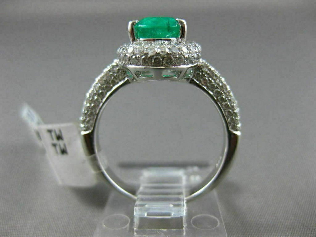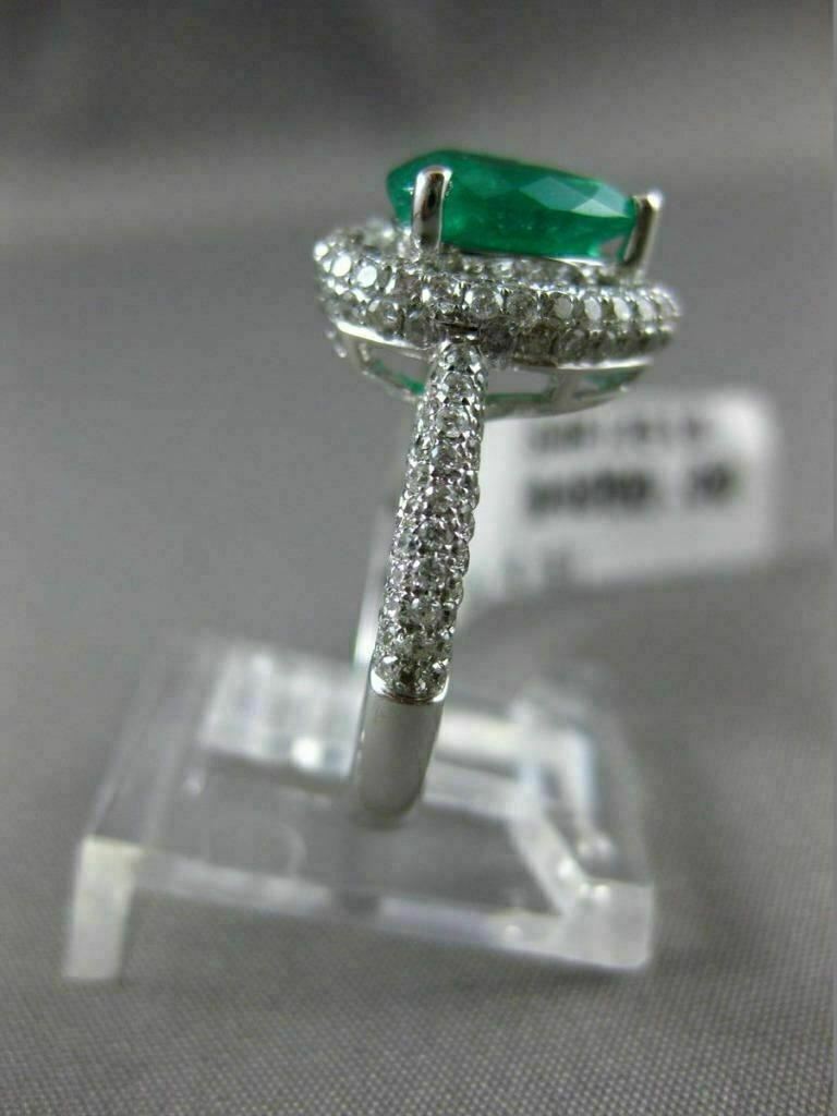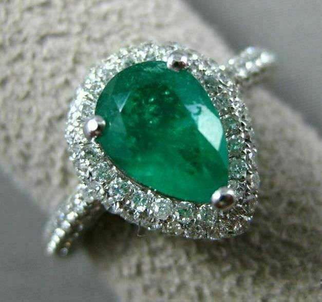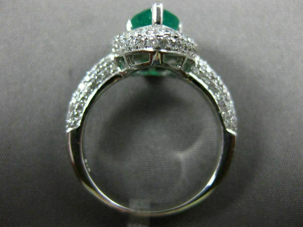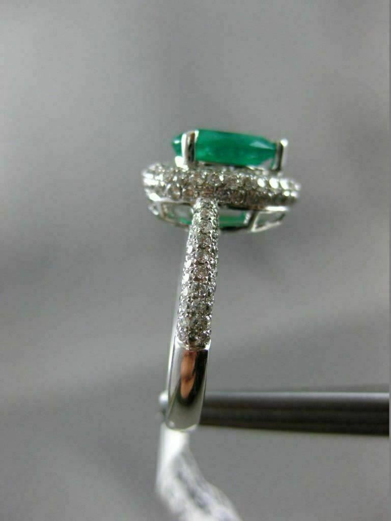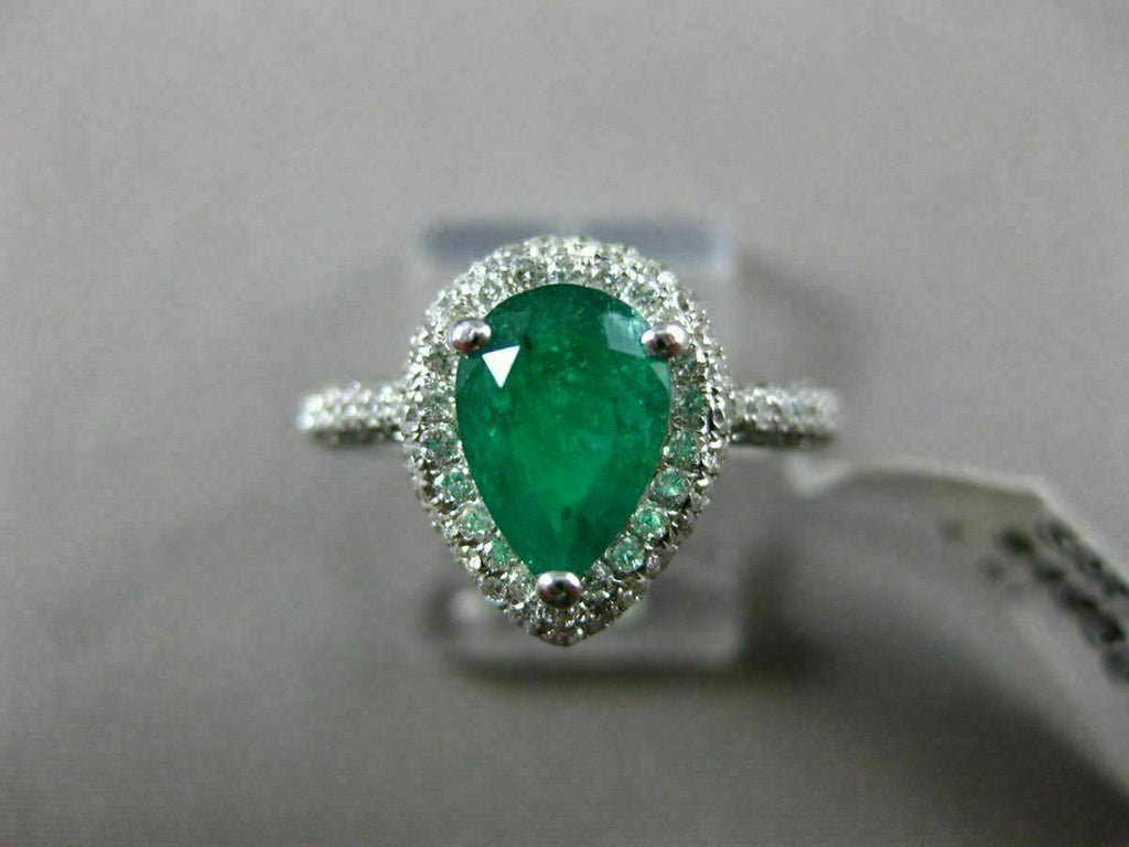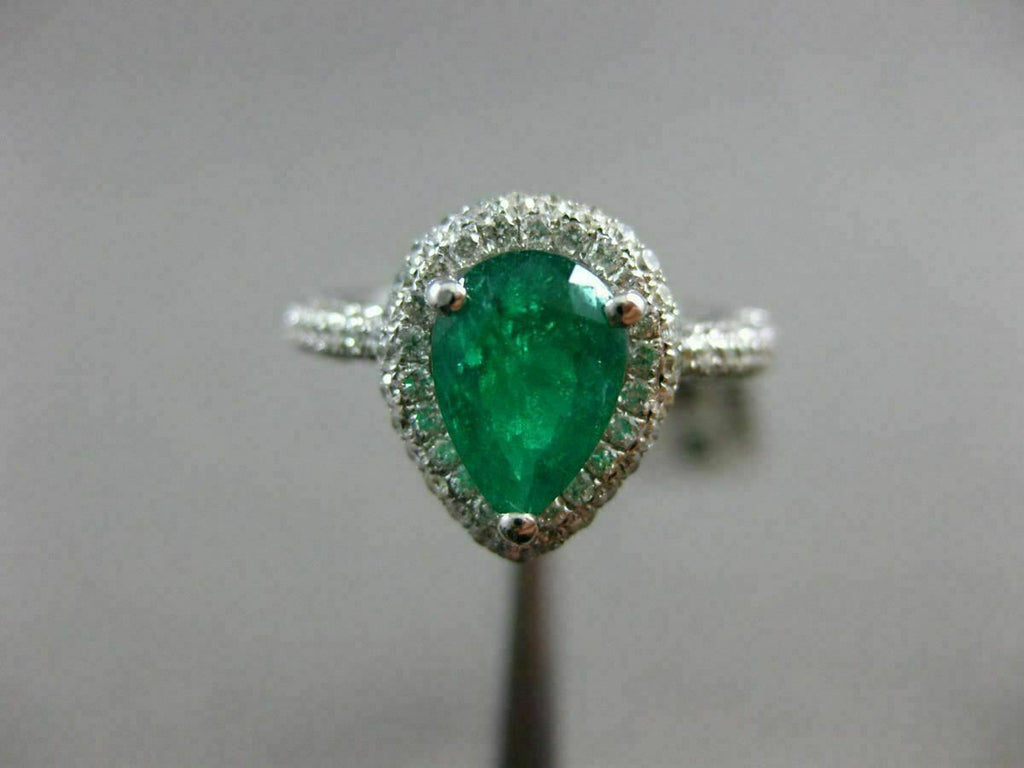 ESTATE 14KT WHITE GOLD ENGAGEMENT RING. 3D DOUBLE HALO PEAR SHAPE DESIGN. DIAMONDS ARE F/G COLOR, VSSI CLARITY .88 CARATS. AAA EMERALD IS 1.26 CARATS. MEASURES 12mm WIDE. RING SIZE 6.50. CAN BE SIZED BY OUR MASTER JEWELER UPON REQUEST. WRITTEN APPRAISAL AVAILABLE. COMES IN A PRESENTABLE GIFT BOX
