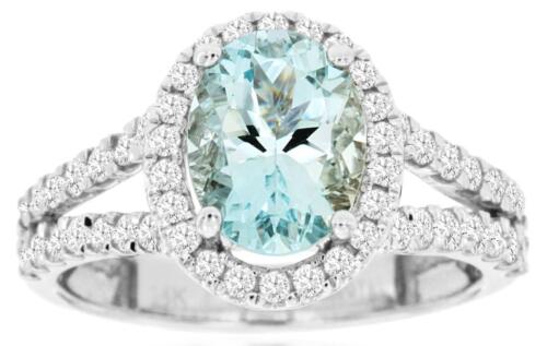 14KT WHITE GOLD ENGAGEMENT RING. 3D CLASSIC HALO DESIGN. ROUND DIAMONDS ARE F/G COLOR, VSSI CLARITY .72 CARATS. AAA EXTRA FACETED OVAL AQUAMARINE IS 1.45 CARATS. RING SIZE 7. CAN BE SIZED BY OUR MASTER JEWELER UPON REQUEST. WRITTEN APPRAISAL AVAILABLE. COMES IN A PRESENTABLE GIFT BOX.