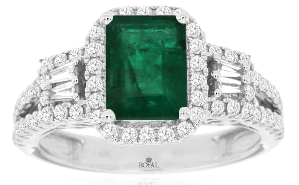 2.18CT DIAMOND & AAA EMERALD 14KT WHITE GOLD 3D ROUND & BAGUETTE ENGAGEMENT RING