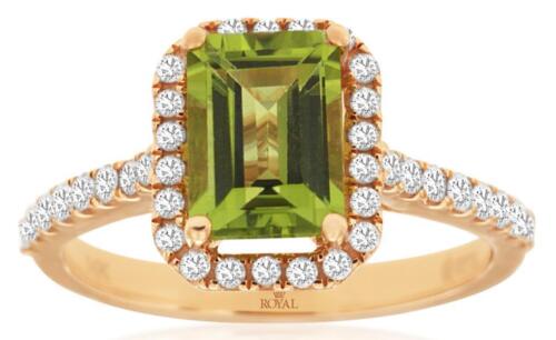 14KT ROSE GOLD FRIENDSHIP FUN RING. 3D SQUARE HALO DESIGN. ROUND DIAMONDS ARE F/G COLOR, VSSI CLARITY .45 CARATS. AAA BAGUETTE PERIDOT IS 1.65 CARATS. RING SIZE 7. CAN BE SIZED BY OUR MASTER JEWELER UPON REQUEST. WRITTEN APPRAISAL AVAILABLE. COMES IN A PRESENTABLE GIFT BOX.