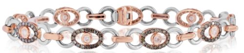 14KT WHITE AND ROSE GOLD FUN TENNIS BRACELET. 3D MULTI OVAL AND CIRCULAR LINK DESIGN. ROUND WHITE DIAMONDS ARE F/G COLOR, VSSI CLARITY .60 CARATS. ROUND CHOCOLATE FANCY DIAMONDS ARE 1.60 CARATS. 7" INCHES LONG.