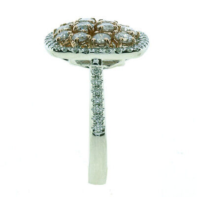 18KT WHITE AND ROSE GOLD LOVE RING. 3D CLUSTER SQUARE DESIGN. ROUND WHITE DIAMONDS ARE F/G COLOR, VSSI CLARITY .77 CARATS. ROUND PINK DIAMONDS ARE 1.44 CARATS. RING SIZE 7. CAN BE SIZED BY OUR MASTER JEWELER UPON REQUEST. WRITTEN APPRAISAL AVAILABLE. COMES IN A PRESENTABLE GIFT BOX.