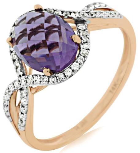14KT ROSE GOLD FUN RING. 3D DOUBLE INFINITY DESIGN. ROUND DIAMONDS ARE F/G COLOR, VSSI CLARITY .22 CARATS. AAA EXTRA FACETED OVAL AMETHYST IS 2.0 CARATS. RING SIZE 7. CAN BE SIZED BY OUR MASTER JEWELER UPON REQUEST. WRITTEN APPRAISAL AVAILABLE. COMES IN A PRESENTABLE GIFT BOX.