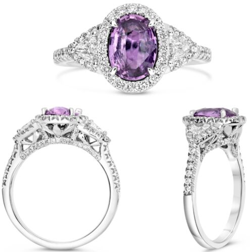 PLATINUM ENGAGEMENT RING. 3D THREE STONE HALO DESIGN. DIAMONDS ARE F/G COLOR, VS CLARITY. ROUND DIAMONDS ARE .45 CARATS. TRILLION CUT DIAMONDS ARE .21 CARATS. AAA EXTRA FACETED OVAL PIINK SAPPHIRE IS 1.56 CARATS. RING SIZE 6.5. CAN BE SIZED BY OUR MASTER JEWELER UPON REQUEST. WRITTEN APPRAISAL AVAILABLE. COMES IN A PRESENTABLE GIFT BOX.