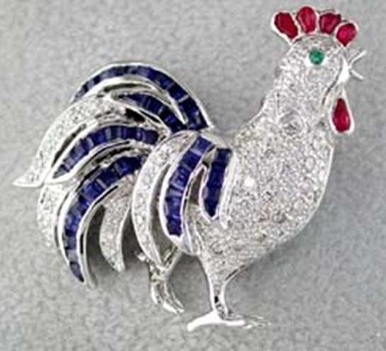 14KT WHITE GOLD BROOCH PIN. 3D HAPPY ROOSTER DESIGN. DIAMONDS ARE F/G COLOR, VSSI CLARITY .55 CARATS. AAA MUTLI COLOR SAPPHIRES ARE 1.70 CARATS. WRITTEN APPRAISAL AVAILABLE. COMES IN A PRESENTABLE GIFT BOX.