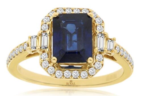 14KT YELLOW GOLD ENGAGEMENT RING. 3D HALO OCTAGON DESIGN. ROUND DIAMONDS ARE F/G COLOR, VSSI CLARITY .40 CARATS. AAA EXTRA FACETED EMERALD CUT SAPPHIRE IS 1.85 CARATS. RING SIZE 7. CAN BE SIZED BY OUR MASTER JEWELER UPON REQUEST. WRITTEN APPRAISAL AVAILABLE. COMES IN A PRESENTABLE GIFT BOX.