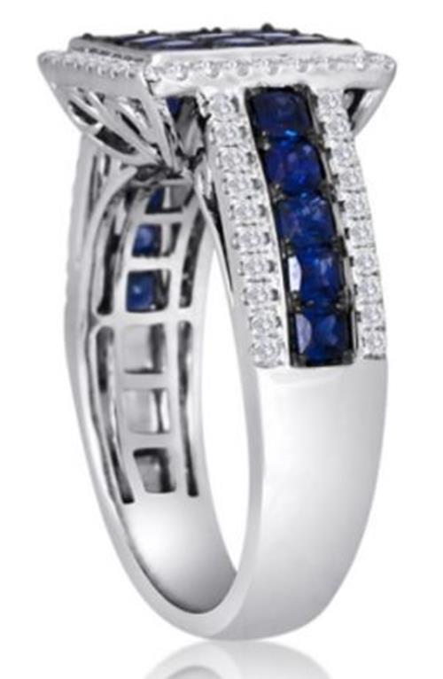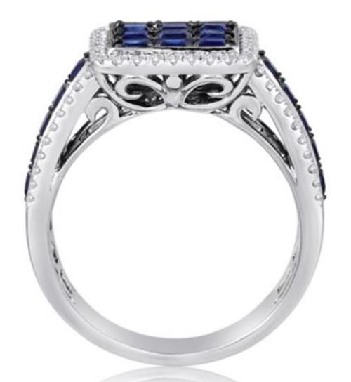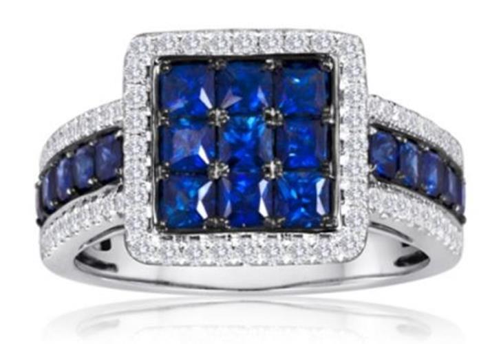 14KT WHITE AND BLACK GOLD FUN RING. 3D SQUARE HALO DESIGN. ROUND DIAMONDS ARE F/G COLOR, VSSI CLARITY .37 CARATS. AAA SQUARE SAPPHIRES ARE 1.90 CARATS. MEASURES 5.9mm WIDE. RING SIZE 6.5. CAN BE SIZED BY OUR MASTER JEWELER UPON REQUEST. WRITTEN APPRAISAL AVAILABLE. COMES IN A PRESENTABLE GIFT BOX.