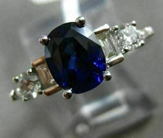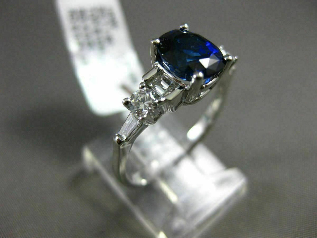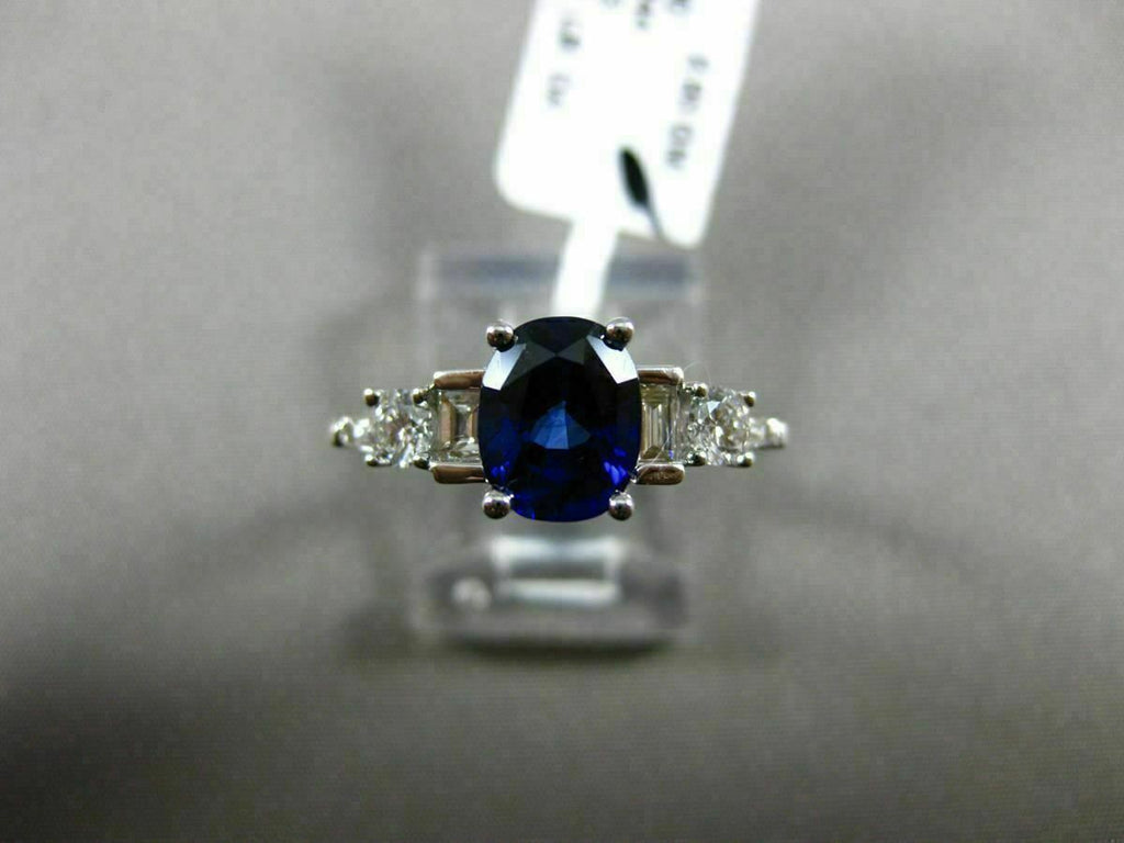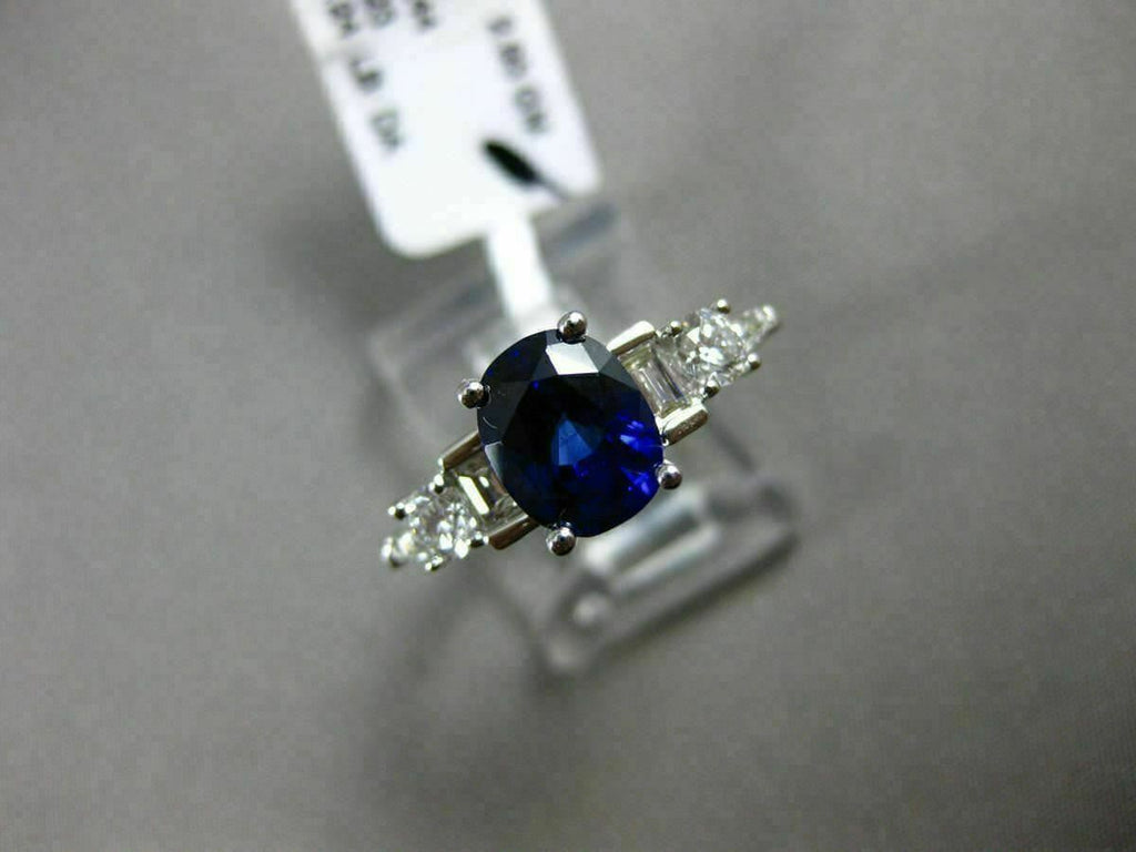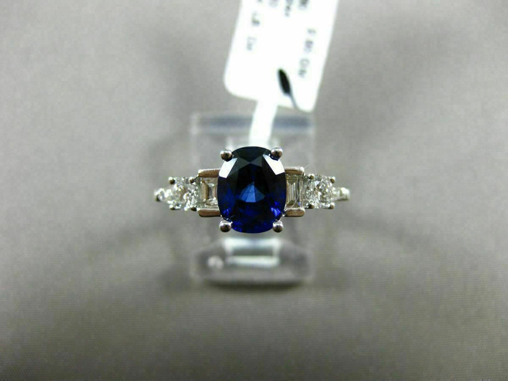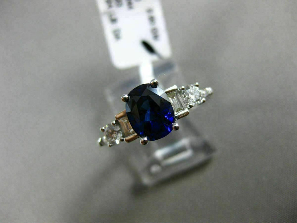 18KT WHITE GOLD ENGAGEMENT RING. 3D OVAL DESIGN. ROUND & EMERALD CUT DIAMONDS ARE F/G COLOR, VSSI CLARITY .47 CARATS. AAA SAPPHIRES IS 1.80 CARATS. MEASURES 7mm WIDE. RING SIZE 6.75. CAN BE SIZED BY OUR MASTER JEWELER UPON REQUEST. WRITTEN APPRAISAL AVAILABLE. COMES IN A PRESENTABLE GIFT BOX.
