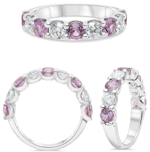 14KT WHITE GOLD WEDDING ANNIVERSARY RING. 3D CLASSIC NINE STONE LUCIDA SHARED PRONG DESIGN. ROUND DIAMONDS ARE F/G COLOR, VS CLARITY .89 CARATS. AAA ROUND PINK SAPPHIRE ARE 1.39 CARATS. RING SIZE 6.5. CAN BE SIZED BY OUR MASTER JEWELER UPON REQUEST. WRITTEN APPRAISAL AVAILABLE. COMES IN A PRESENTABLE GIFT BOX.