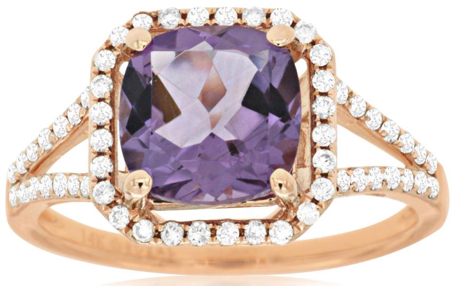 14KT ROSEGOLD FUN RING. 3D HALO OCTAGON DESIGN. ROUND DIAMONDS ARE F/G COLOR, VSSI CLARITY 0.30 CARATS. AAA EXTRA FACETED CUSHION AMETHYST IS 1.90 CARATS.RING SIZE 7. CAN BE SIZED BY OUR MASTER JEWELER UPON REQUEST. WRITTEN APPRAISAL AVAILABLE. COMES IN A PRESENTABLE GIFT BOX.