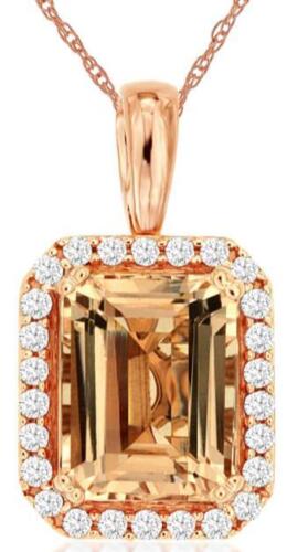 14KT ROSE GOLD FLOATING PENDANT. 3D SQUARE OCTAGON HALO DESIGN. ROUND DIAMONDS ARE F/G COLOR, VSSI CLARITY .20 CARATS. AAA EXTRA FACETED EMERALD CUT MORAGNITE IS 2.10 CARATS. COMES ON A 14KT GOLD DIAMOND CUT 16" INCH CHAIN. WRITTEN APPRAISAL AVAILABLE. COMES IN A PRESENTABLE GIFT BOX.