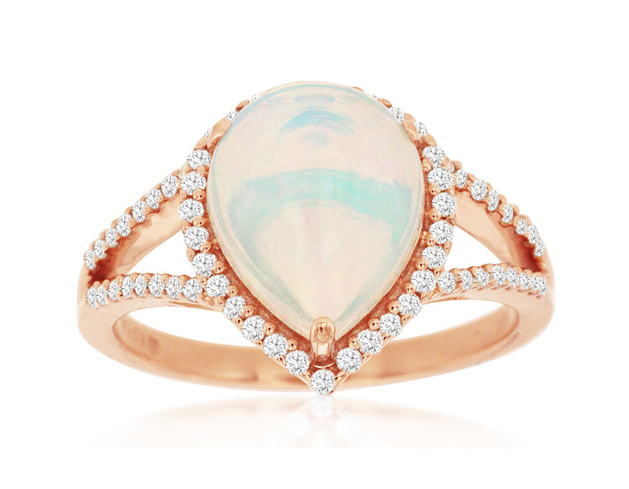 14KT ROSE GOLD FUN RING. 3D CLASSIC HALO DESIGN. ROUND DIAMONDS ARE F/G COLOR, VSSI CLARITY .30 CARATS. AAA PEAR SHAPE OPAL IS 2.0 CARATS. RING SIZE 7. CAN BE SIZED BY OUR MASTER JEWELER UPON REQUEST. WRITTEN APPRAISAL AVAILABLE. COMES IN A PRESENTABLE GIFT BOX.