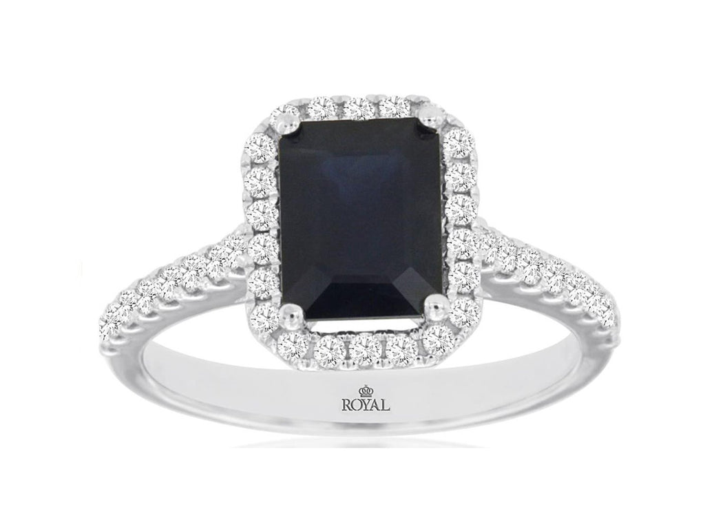 14KT WHITE GOLD ENGAGEMENT RING. 3D HALO DESIGN. ROUND DIAMONDS ARE F/G COLOR, VSSI CLARITY .45 CARATS. AAA EMERALD CUT SAPPHIRE IS 1.85 CARATS. RING SIZE 7. CAN BE SIZED BY OUR MASTER JEWELER UPON REQUEST. WRITTEN APPRAISAL AVAILABLE. COMES IN A PRESENTABLE GIFT BOX.