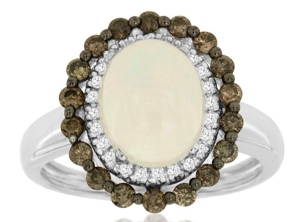 2.30CT WHITE & MOCHA DIAMOND & AAA OPAL 14KT WHITE GOLD OVAL & ROUND FLOWER RING