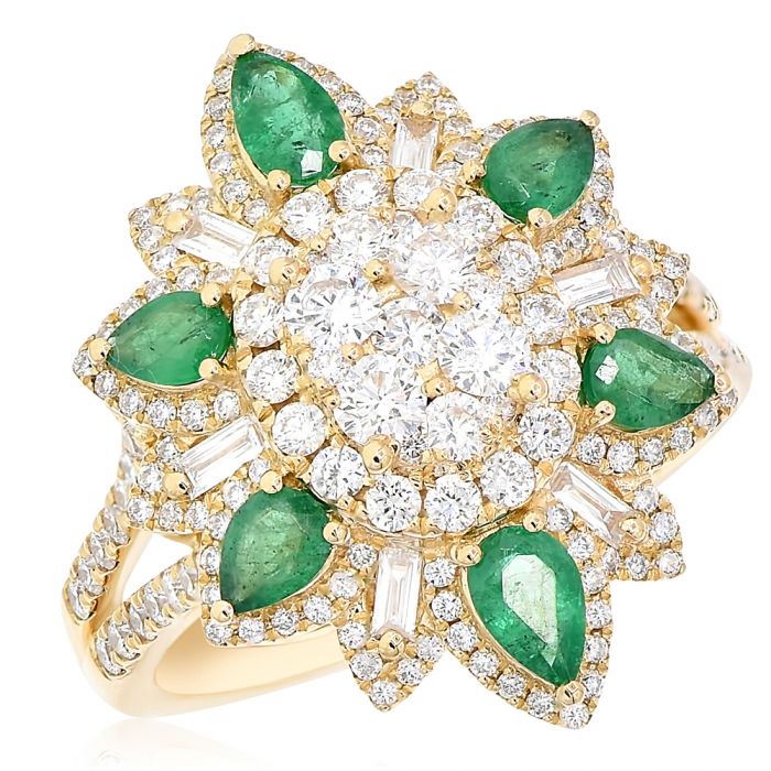 18KT YELLOW GOLD COCKTAIL RING. 3D FLOWER STAR DESIGN. ROUND & BAGUETTE DIAMONDS ARE F/G COLOR, VSSI CLARITY 1.39 CARATS. AAA PEAR SHAPE EMERALDS ARE .93 CARATS. RING SIZE 7. CAN BE SIZED BY OUR MASTER JEWELER UPON REQUEST. WRITTEN APPRAISAL AVAILABLE. COMES IN A PRESENTABLE GIFT BOX.