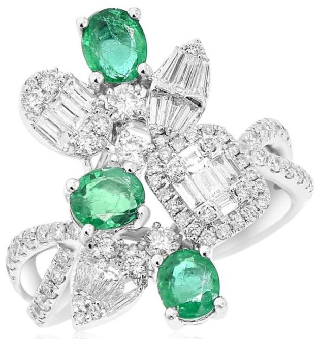18KT WHITE GOLD FUN COCKTAIL RING. 3D MULTI SHAPE DESIGN. ROUND AND BAGUETTE DIAMONDS ARE F/G COLOR, VSSI CLARITY 1.15 CARATS. AAA OVAL EMERALDS ARE 1.19 CARATS. RING SIZE 7. CAN BE SIZED BY OUR MASTER JEWELER UPON REQUEST. WRITTEN APPRAISAL AVAILABLE. COMES IN A PRESENTABLE GIFT BOX.