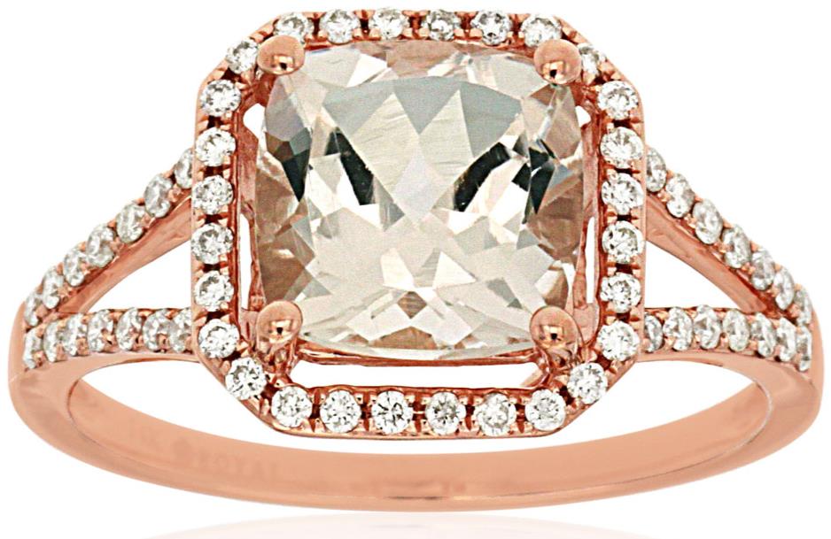 14KT ROSE GOLD ENGAGEMENTRING. 3D HALO OCTAGONDESIGN. ROUND DIAMONDS ARE F/G COLOR, VSSI CLARITY 0.30 CARATS. AAA EXTRA FACETED CUSHION MORGANITE IS 2.00 CARATS.RING SIZE 7. CAN BE SIZED BY OUR MASTER JEWELER UPON REQUEST. WRITTEN APPRAISAL AVAILABLE. COMES IN A PRESENTABLE GIFT BOX.