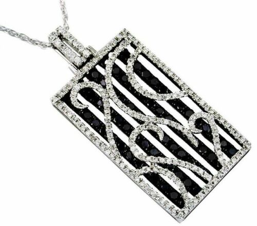 14KT WHITE GOLD PENDANT. 3D OPEN FILIGREE DESIGN. WHITE DIAMONDS ARE F/G COLOR, VSSI CLARITY .60 CARATS. BLACK DIAMONDS ARE 1.80 CARATS. COMES ON A 14KT GOLD DIAMOND CUT 16" INCH CHAIN. WRITTEN APPRAISAL AVAILABLE. COMES IN A PRESENTABLE GIFT BOX.