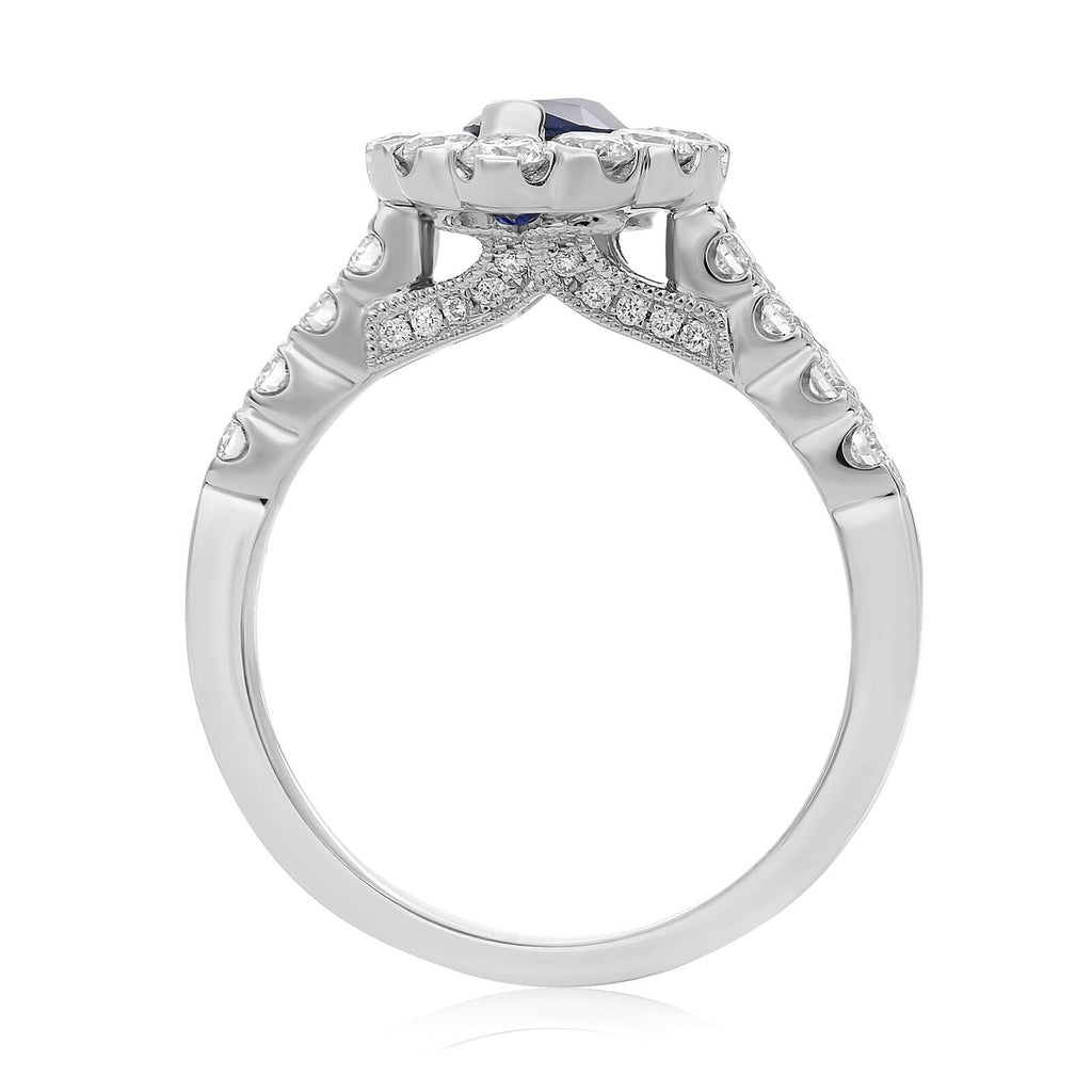 18KT WHITE GOLD ENGAGEMENT RING. 3D MARQUISE SHAPE HALO DESIGN. DIAMONDS ARE F/G COLOR, VSSI CLARITY 1.03 CARATS. AAA SAPPHIRE IS 1.40 CARATS. MEASURES 16mm X 2mm. RING SIZE 6.50. CAN BE SIZED BY OUR MASTER JEWELER UPON REQUEST. WRITTEN APPRAISAL AVAILABLE. COMES IN A PRESENTABLE GIFT BOX.