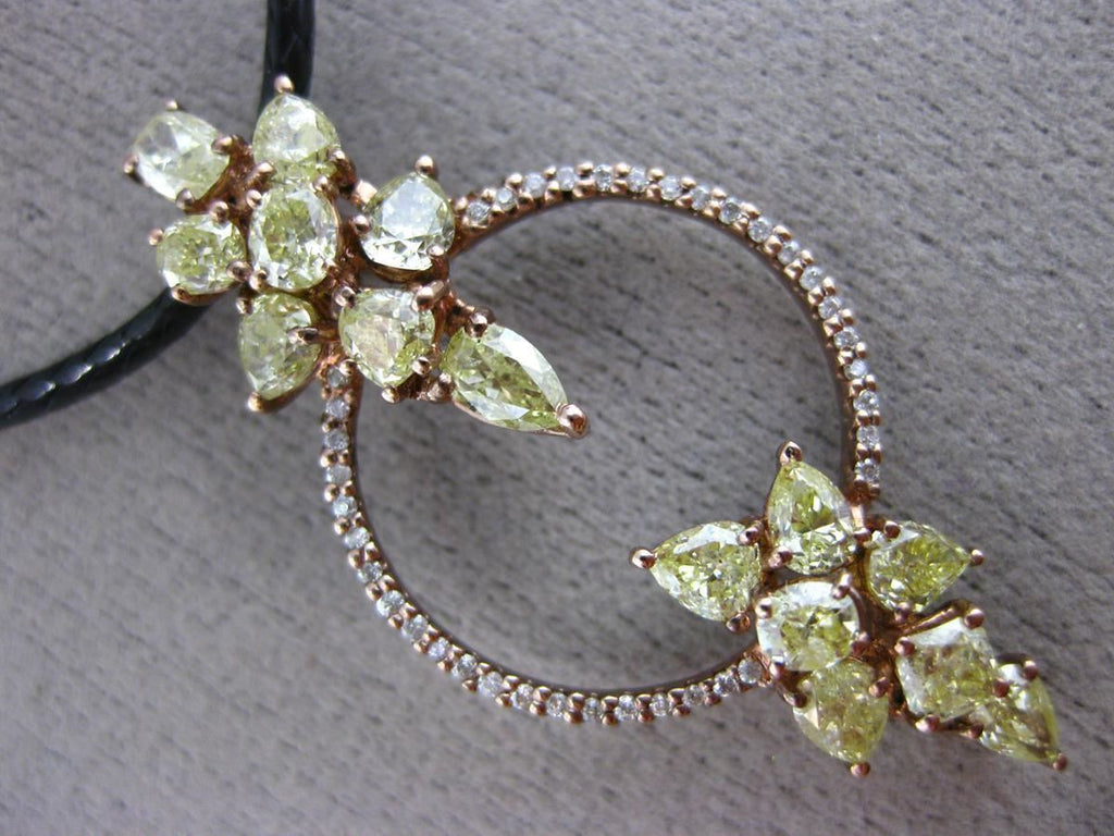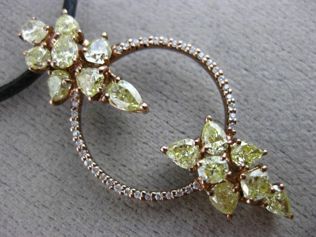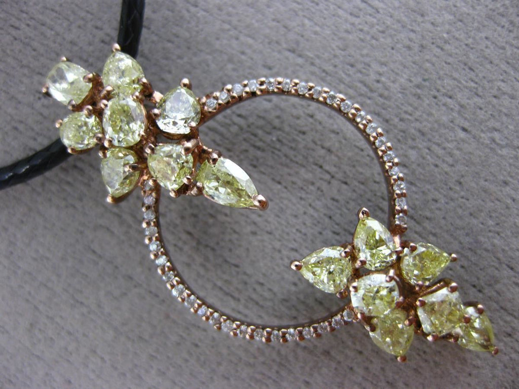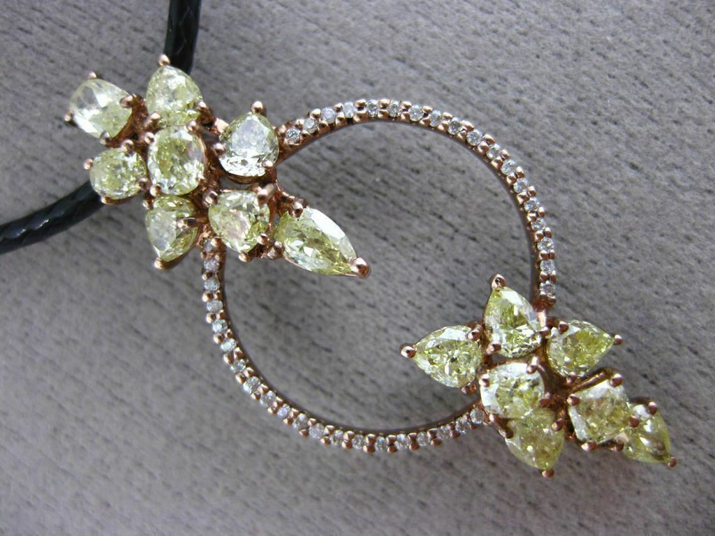 18KT ROSE GOLD PENDANT. 3D MULTI SHAPE CIRCULAR LEAF DESIGN. WHITE DIAMONDS ARE F/G COLOR, VSSI CLARITY .11 CARATS. FANCY YELLOW DIAMONDS ARE 2.34 CARATS. MEASURES 37mm X 18mm. COMES ON A 18-20" INCH LEATHER CHAIN. WRITTEN APPRAISAL AVAILABLE. COMES IN A PRESENTABLE GIFT BOX.