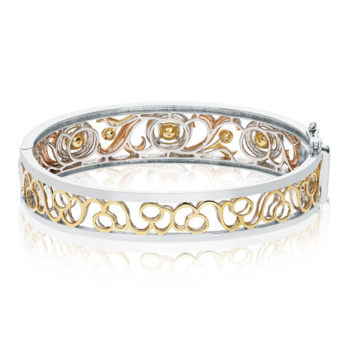 2.46CT MULTI COLOR FANCY DIAMOND 18KT TRI COLOR GOLD 3D FILIGREE BANGLE BRACELET