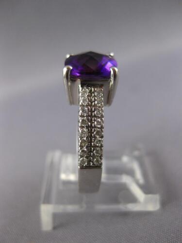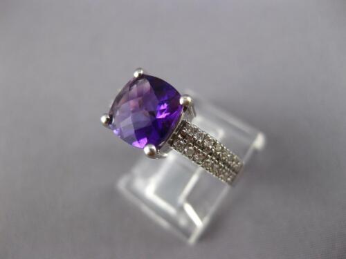 14KT WHITE GOLD FUN RING. 3D CLASSIC SQUARE DESIGN. ROUND DIAMONDS ARE F/G COLOR, VVS-VS CLARITY .20 CARATS. AAA EXTRA FACETED CUSHION CUT AMETHYST IS 2.30 CARATS. MEASURES 8mm WIDE. RING SIZE 6.5. CAN BE SIZED BY OUR MASTER JEWELER UPON REQUEST. WRITTEN APPRAISAL AVAILABLE. COMES IN A PRESENTABLE GIFT BOX.