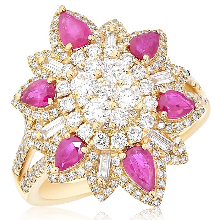 2.50CT DIAMOND & AAA RUBY 18KT YELLOW GOLD ROUND & PEAR SHAPE FLOWER STAR RING
