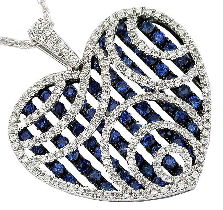 14KT WHITE GOLD LOVE FLOATING PENDANT. 3D OPEN FILIGREE HEART DESIGN. DIAMONDS ARE F/G COLOR, VSSI CLARITY .58 CARATS. AAA SAPPHIRES ARE 1.95 CARATS. COMES ON A 14KT GOLD DIAMOND CUT 18" INCH CHAIN. WRITTEN APPRAISAL AVAILABLE. COMES IN A PRESENTABLE GIFT BOX.