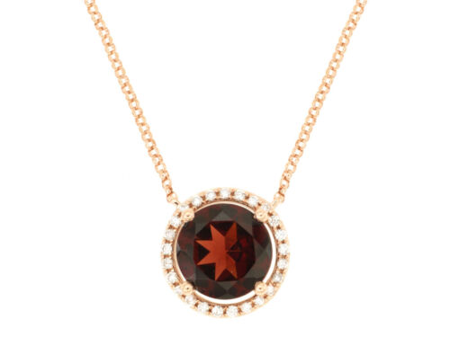 14KT ROSE GOLD LOVE NECKLACE. 3D CLASSIC HALO SOLITAIRE DESIGN. ROUND DIAMONDS ARE F/G COLOR, VSSI CLARITY .14 CARATS. AAA EXTRA FACETED ROUND GARNET IS 2.40 CARATS. 17" INCHES LONG. WRITTEN APPRAISAL AVAILABLE. COMES IN A PRESENTABLE GIFT BOX.