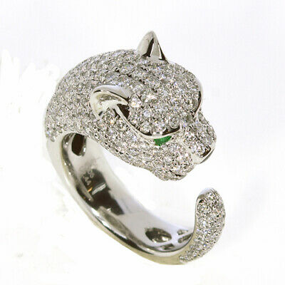 18KT WHITE GOLD FUN RING. 3D HAPPY PANTHER JAGUAR DESIGN. DIAMONDS ARE F/G COLOR, VSSI CLARITY 2.48 CARATS. AAA EMERALDS ARE .07 CARATS. RING SIZE 7. CAN BE SIZED BY OUR MASTER JEWELER UPON REQUEST. WRITTEN APPRAISAL AVAILABLE. COMES IN A PRESENTABLE GIFT BOX.