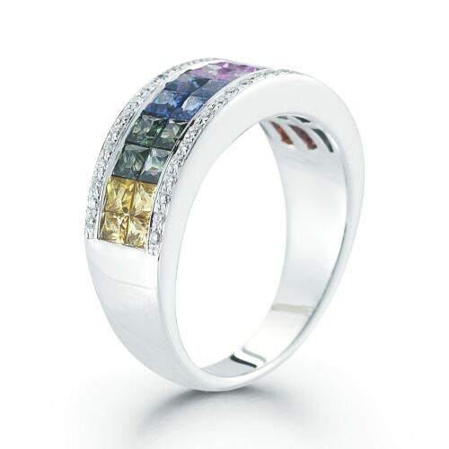 14KT WHITE GOLD FUN RING. 3D TWO ROW INVISIBLE DESIGN. ROUND DIAMONDS ARE F/G COLOR, VSSI CLARITY .15 CARATS. AAA PRINCESS CUT MULTI COLOR SAPPHIRES ARE 2.40 CARATS. RING SIZE 7. CAN BE SIZED BY OUR MASTER JEWELER UPON REQUEST. WRITTEN APPRAISAL AVAILABLE. COMES IN A PRESENTABLE GIFT BOX.