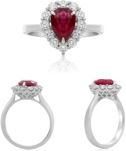 18KT WHITE GOLD ENGAGEMENT RING. 3D CLASSIC HALO DESIGN. ROUND DIAMONDS ARE F/G COLOR, VS CLARITY .77 CARATS. AAA PEAR SHAPE RUBY IS 1.78 CARATS. RING SIZE 6.5. CAN BE SIZED BY OUR MASTER JEWELER UPON REQUEST. WRITTEN APPRAISAL AVAILABLE. COMES IN A PRESENTABLE GIFT BOX.