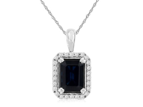 14KT WHITE GOLD FLOATING PENDANT. 3D SQUARE OCTAGON DESIGN. ROUND DIAMONDS ARE F/G COLOR, VSSI CLARITY .20 CARATS. AAA EXTRA FACETED EMERALD CUT SAPPHIRE IS 2.30 CARATS. COMES ON A 14KT GOLD DIAMOND CUT 16" INCH CHAIN. WRITTEN APPRAISAL AVAILABLE. COMES IN A PRESENTABLE GIFT BOX.