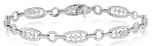 14KT WHITE GOLD FUN TENNIS BRACELET. 3D PAST PRESENT FUTURE OVAL AND CIRCULAR LINK DESIGN. ROUND DIAMONDS ARE F/G COLOR, VSSI CLARITY 2.60 CARATS. 7" INCHES LONG.