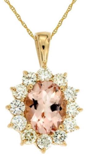 14KT YELLOW GOLD FLOATING PENDANT. 3D FLOWER PRINCESS DIANA DESIGN. ROUND DIAMONDS ARE F/G COLOR, VSSI CLARITY 1.0 CARAT. AAA EXTRA FACETED OVAL MORGANITE IS 1.60 CARATS. COMES ON A 14KT GOLD DIAMOND CUT 16" INCH CHAIN. WRITTEN APPRAISAL AVAILABLE. COMES IN A PRESENTABLE GIFT BOX.