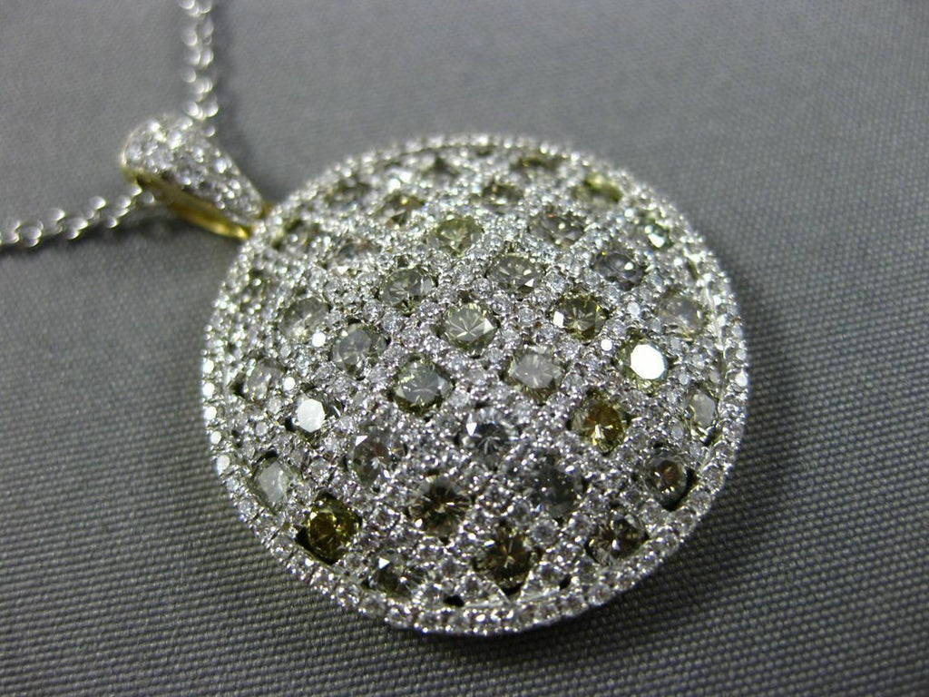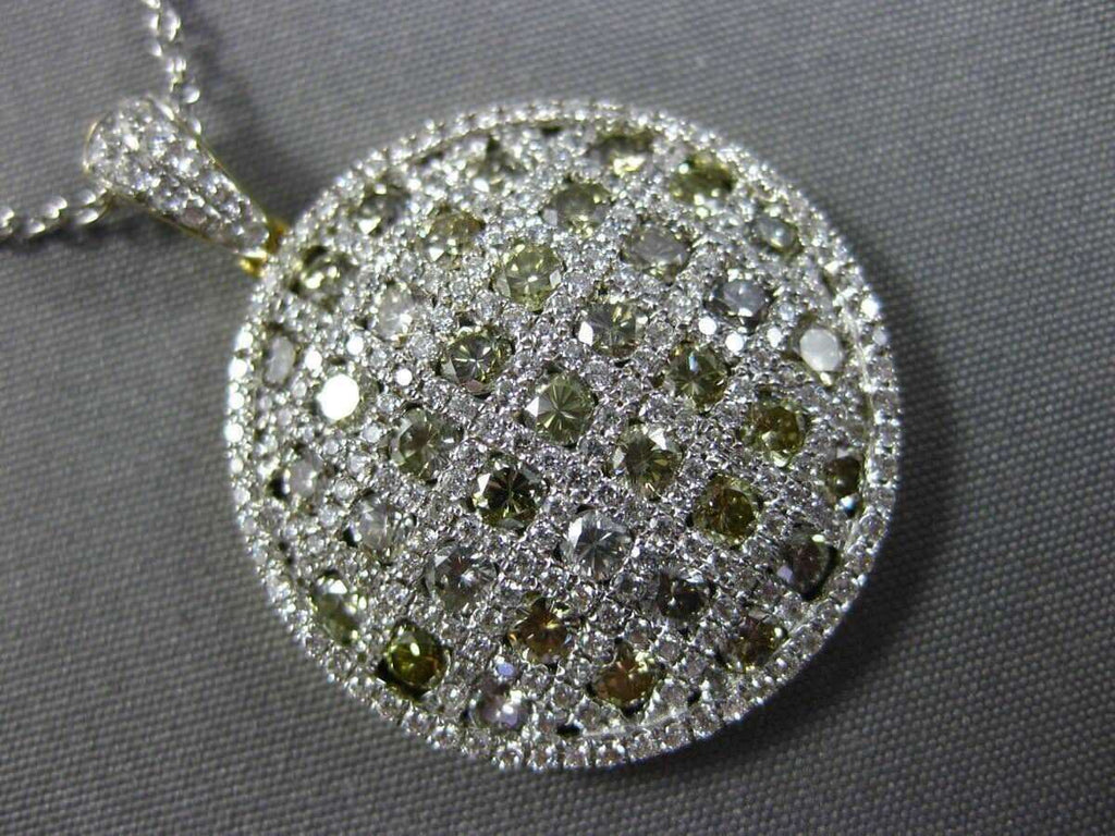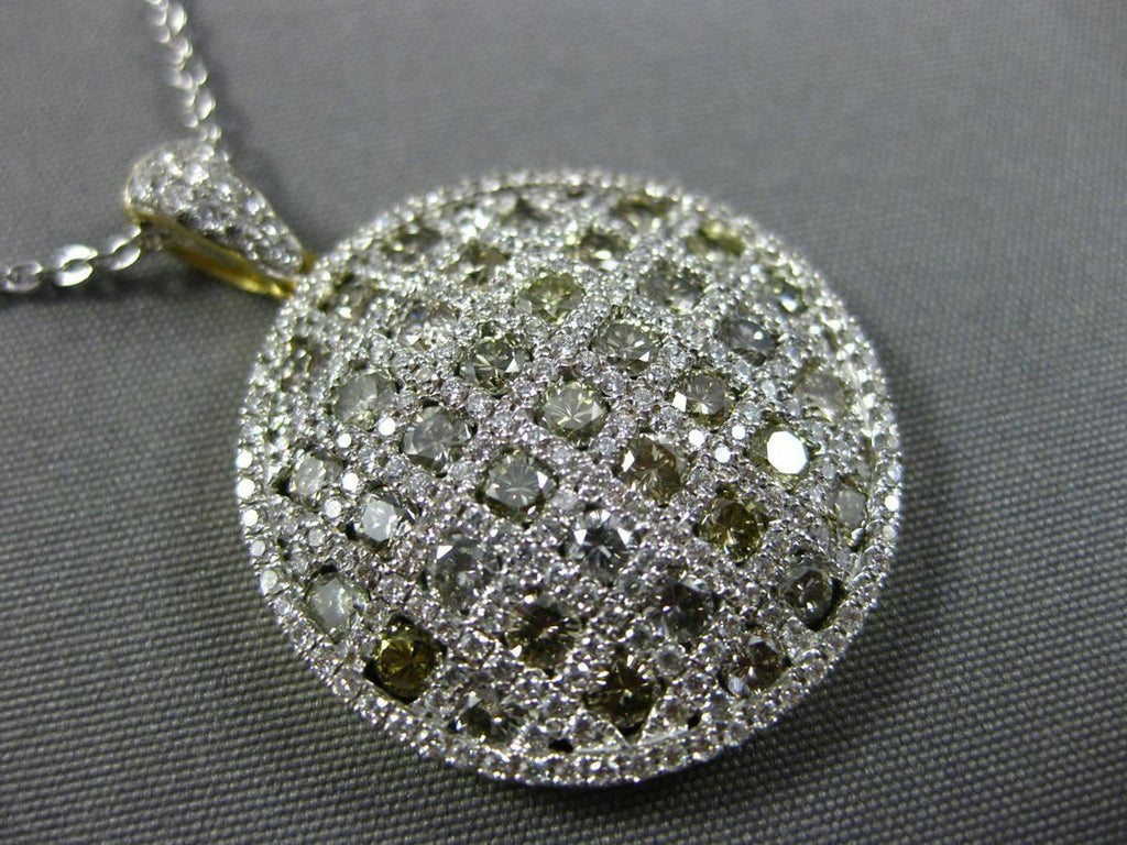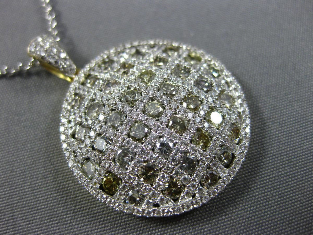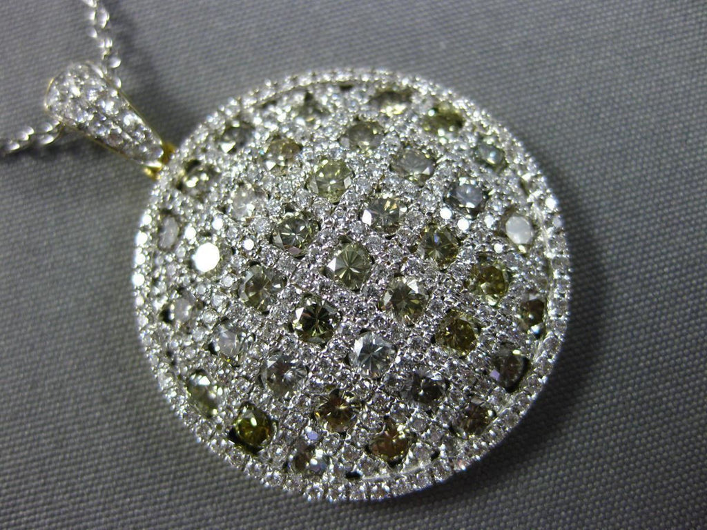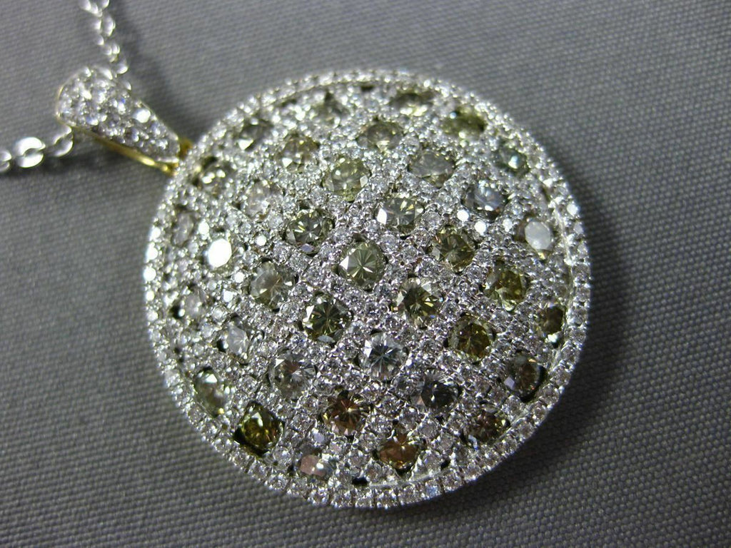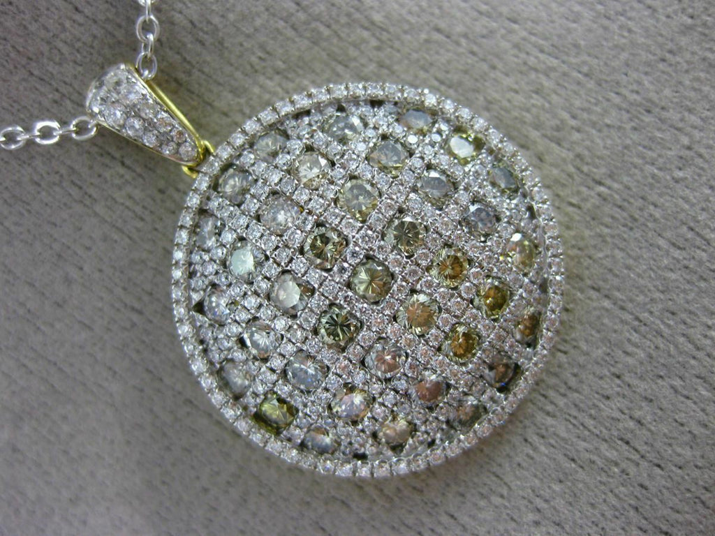 18KT WHITE & YELLOW GOLD PENDANT. 3D CRISS CROSS CIRCULAR DESIGN. DIAMONDS ARE F/G COLOR, VSSI CLARITY. FANCY COLOR DIAMONDS ARE VSSI CLARITY. WHITE & FANCY COLOR DIAMONDS ARE 2.61 CARATS. MEASURES 30mm X 22mm. COMES ON A 14KT GOLD DIAMOND CUT 16" INCH CHAIN. WRITTEN APPRAISAL AVAILABLE. COMES IN A PRESENTABLE GIFT BOX.