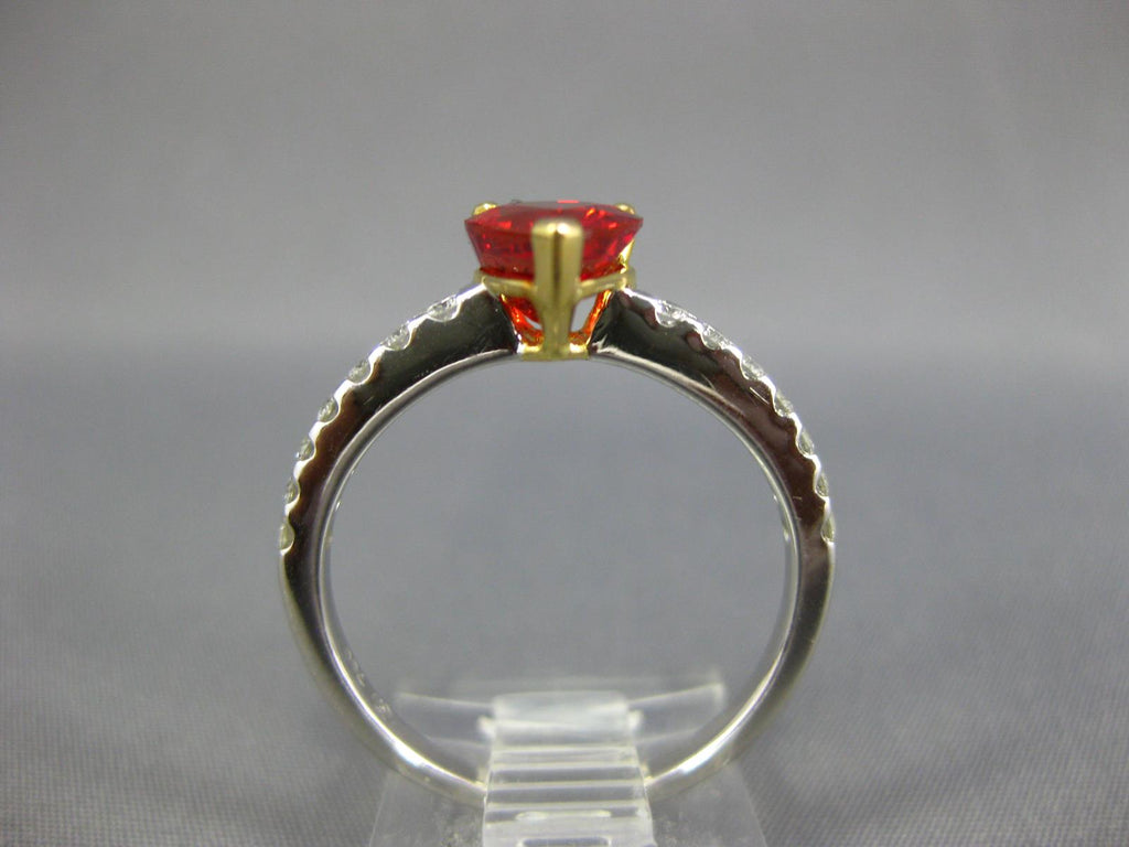 18KT WHITE AND YELLOW GOLD ENGAGEMENT RING. 3D DESIGN. DIAMONDS ARE F/G COLOR, VSSI CLARITY .30 CARATS. AAA PEAR SHAPE ORANGE SAPPHIRE IS 2.36 CARATS. MEASURES 8.6mm WIDE. RING SIZE 8. CAN BE SIZED BY OUR MASTER JEWELER UPON REQUEST. WRITTEN APPRAISAL AVAILABLE. COMES IN A PRESENTABLE GIFT BOX.