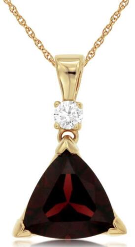 14KT YELLOW GOLD FUN FLOATING PENDANT. 3D CLASSIC DESIGN. ROUND DIAMONDS ARE F/G COLOR, VSSI CLARITY .10 CARATS. AAA EXTRA FACETED TRILLION CUT GARNET IS 2.50 CARATS. COMES ON A 14KT GOLD DIAMOND CUT 18" INCH CHAIN. WRITTEN APPRAISAL AVAILABLE. COMES IN A PRESENTABLE GIFT BOX.