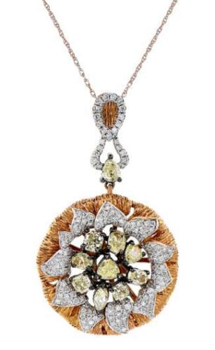 18KT ROSE GOLD LOVE FLOATING PENDANT. 3D FLOWER DESIGN. WHITE DIAMONDS ARE F/G COLOR, VSSI CLARITY .65 CARATS. FANCY YELLOW DIAMONDS ARE 1.95 CARATS. COMES ON A 14KT GOLD DIAMOND CUT 16" INCH CHAIN. WRITTEN APPRAISAL AVAILABLE. COMES IN A PRESENTABLE GIFT BOX.