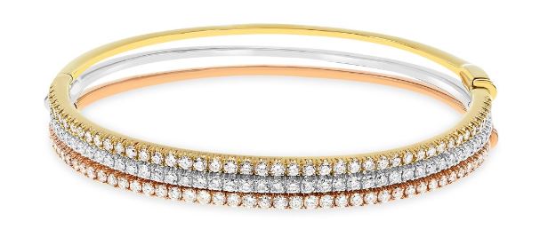 18KT WHITE, YELLOW AND ROSE GOLD FUN BANGLEBRACELET. 3D SEMI ETERNITY STACKABLE CLASSICDESIGN. ROUND DIAMONDS ARE F/G COLOR, VSSI CLARITY 2.70 CARATS.FITS UP TO 7" INCH WRIST. WRITTEN APPRAISAL AVAILABLE. COMES IN A PRESENTABLE GIFT BOX.SERIOUS OFFERS CONSIDERED