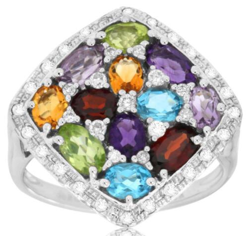 14KT WHITE GOLD FUN RING. 3D CLUSTER SQUARE GEOMETRICAL DESIGN. ROUND DIAMONDS ARE F/G COLOR, VSSI CLARITY .32 CARATS. AAA BLUE TOPAZ, PERIDOTS, AMETHYSTS, GARNETS, AND CITRINES ARE 2.40 CARATS. RING SIZE 7. CAN BE SIZED BY OUR MASTER JEWELER UPON REQUEST. WRITTEN APPRAISAL AVAILABLE. COMES IN A PRESENTABLE GIFT BOX.