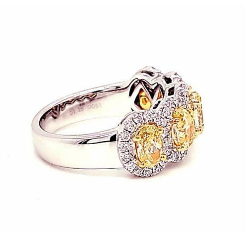 18KT WHITE AND YELLOW GOLD ANNIVERSARY RING. 3D FIVE STONE HALO DESIGN. ROUND DIAMONDS ARE F/G COLOR, VSSI CLARITY .51 CARATS. OVAL FANCY YELLOW DIAMONDS ARE 2.25 CARATS. RING SIZE 7. CAN BE SIZED BY OUR MASTER JEWELER UPON REQUEST. WRITTEN APPRAISAL AVAILABLE. COMES IN A PRESENTABLE GIFT BOX.