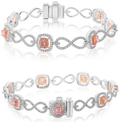 18KT WHITE AND ROSE GOLD LOVE TENNIS BRACELET. 3D DOUBLE HALO INFINITY DESIGN. WHITE ROUND DIAMONDS ARE F/G COLOR, VS CLARITY 1.67 CARATS. PINK ROUND DIAMONDS ARE .23 CARATS. PINK MULTI SHAPE DIAMONDS ARE .93 CARATS. 7" INCHES LONG.