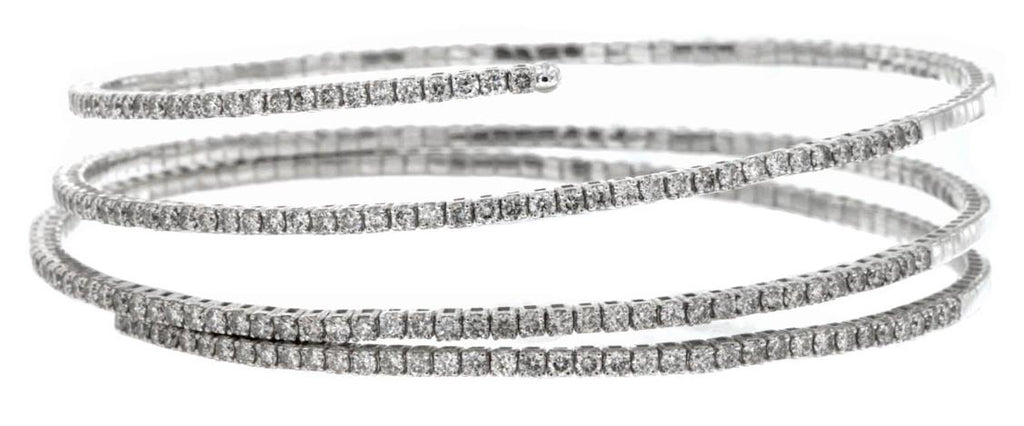 14KT WHITE GOLD BANGLE BRACELET. 3D MULTI ROW CRISS CROSS FLEXIBLE DESIGN. ROUND DIAMONDS ARE F/G COLOR, VSSI CLARITY 2.85 CARATS. FITS UP TO 7" INCH WRIST. WRITTEN APPRAISAL AVAILABLE. COMES IN A PRESENTABLE GIFT BOX.