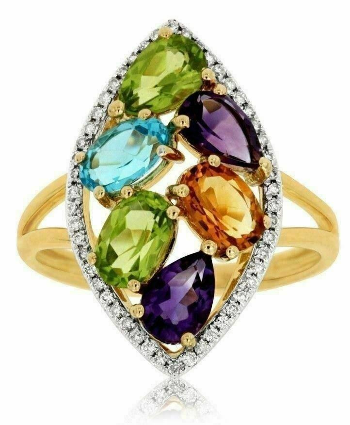 2.90CT DIAMOND & AAA MULTI COLOR GEM 14KT YELLOW GOLD 3D MARQUISE SHAPE FUN RING
