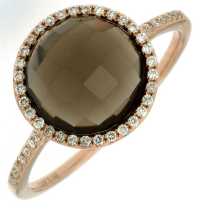 14KT ROSE GOLD FUN RING. 3D HALO DESIGN. DIAMONDS ARE F/G COLOR, VSSI CLARITY .15 CARATS. AAA ROUND EXTRA FACETED SMOKY TOPAZ IS 2.75 CARATS. RING SIZE 7. CAN BE SIZED BY OUR MASTER JEWELER UPON REQUEST. WRITTEN APPRAISAL AVAILABLE. COMES IN A PRESENTABLE GIFT BOX.