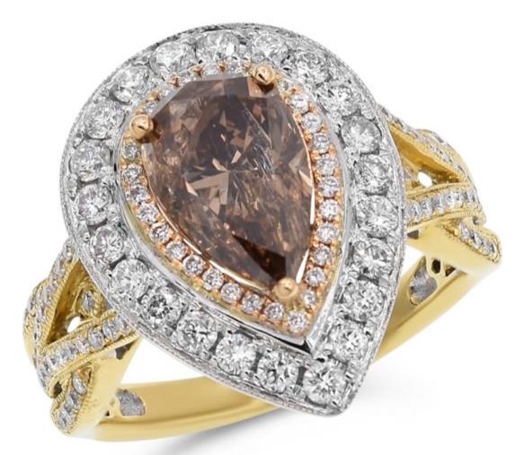 2.99CT WHITE & MOCHA DIAMOND 18KT TRI COLOR GOLD PEAR SHAPE HALO ENGAGEMENT RING