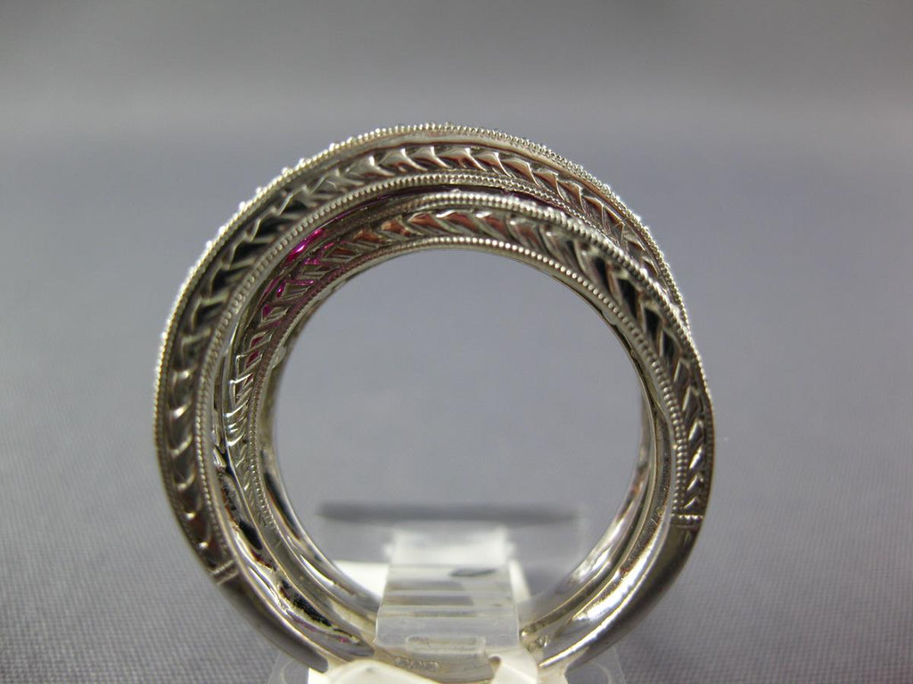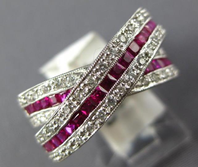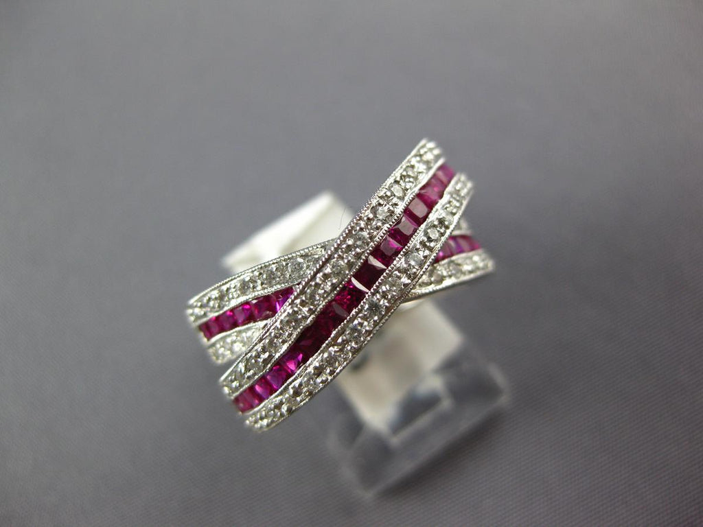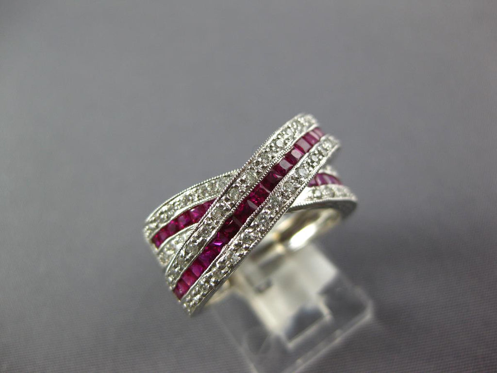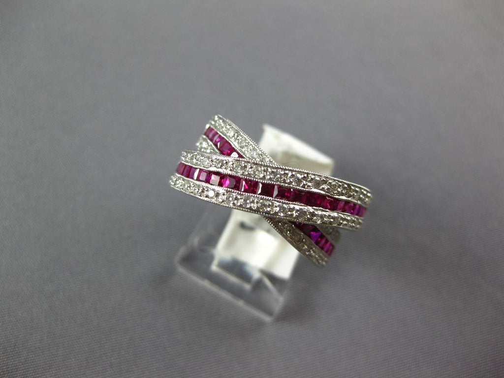 14KT WHITE GOLD LOVE RING. 3D MULTI ROW CRISS CROSS INFINITY DESIGN. ROUND DIAMONDS ARE F/G COLOR, VSSI CLARITY .52 CARATS. AAA PRINCESS CUT RUBIES ARE 1.52 CARATS. MEASURES 6mm WIDE. RING SIZE 7. CAN BE SIZED BY OUR MASTER JEWELER UPON REQUEST. WRITTEN APPRAISAL AVAILABLE. COMES IN A PRESENTABLE GIFT BOX.