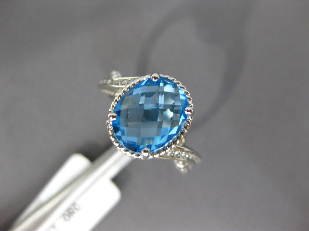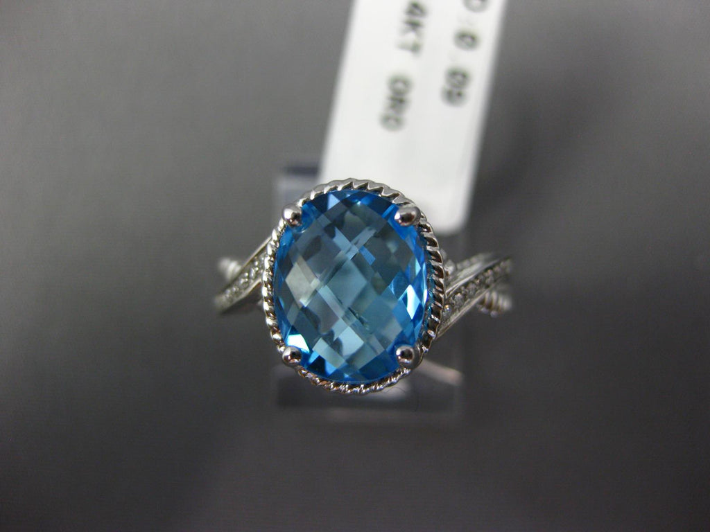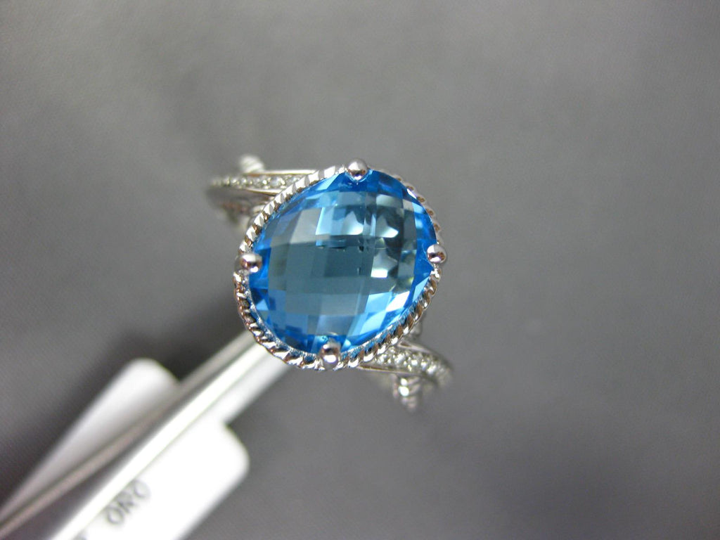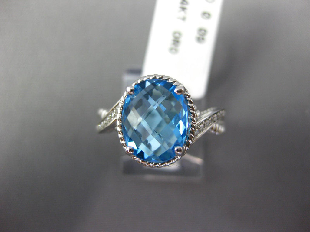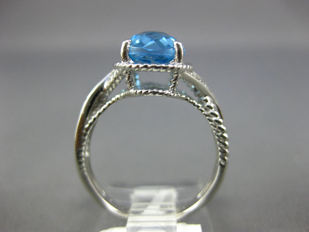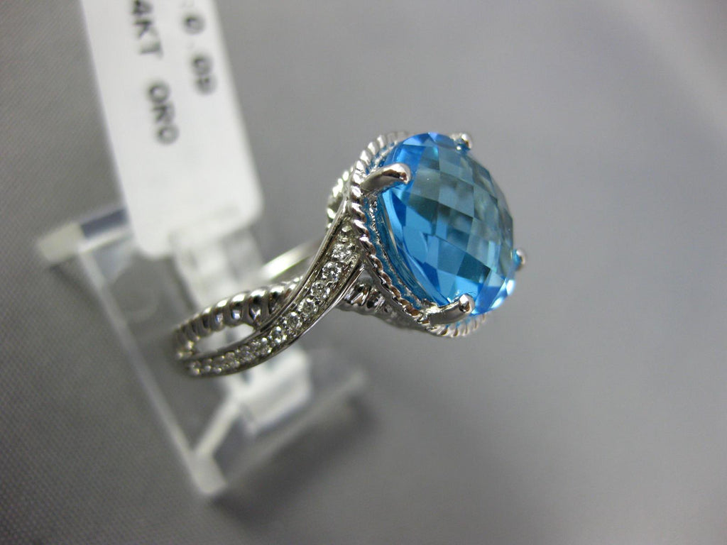 14KT WHITE GOLD FUN RING. 3D INFINITY DESIGN. ROUND DIAMONDS ARE F/G COLOR, VSSI CLARITY .09 CARATS. AAA EXTRA FACETED OVAL BLUE TOPAZ IS 2.0 CARATS. MEASURES 12mm WIDE. RING SIZE 7. CAN BE SIZED BY OUR MASTER JEWELER UPON REQUEST. WRITTEN APPRAISAL AVAILABLE. COMES IN A PRESENTABLE GIFT BOX.