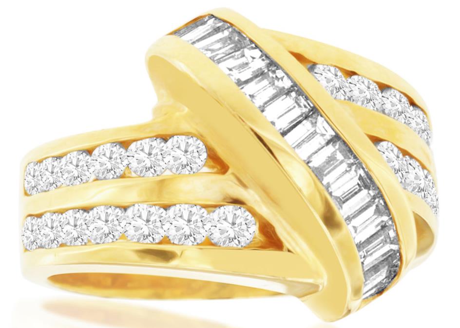 14KT YELLOW GOLD ANNIVERSARY RING. 3D MULTI ROW LOVE KNOT DIAGONAL DESIGN. DIAMONDS ARE F/G COLOR, VSSI CLARITY. ROUND DIAMONDS ARE 1.30 CARATS. BAGUETTE DIAMONDS .80 CARATS. RING SIZE 7. CAN BE SIZED BY OUR MASTER JEWELER UPON REQUEST. WRITTEN APPRAISAL AVAILABLE. COMES IN A PRESENTABLE GIFT BOX.